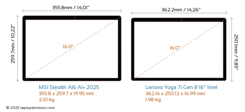 HDMIBoth Stealth A16 AI+ 2025 and Yoga 7i Gen 8 16" Intel feature an HDMI port. Stealth A16 AI+ 2025 offers 1x HDMI 2.1, while Yoga 7i Gen 8 16" Intel offers 1x HDMI 1.4.