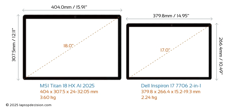 HDMIBoth Titan 18 HX AI 2025 and Inspiron 17 7706 2-in-1 feature an HDMI port. Titan 18 HX AI 2025 offers 1x HDMI 2.1, while Inspiron 17 7706 2-in-1 offers 1x HDMI 1.4.