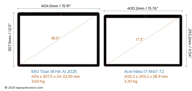 HDMIBoth Titan 18 HX AI 2025 and Nitro 17 AN17-72 feature an HDMI port (1x HDMI 2.1) for connecting to external monitors.