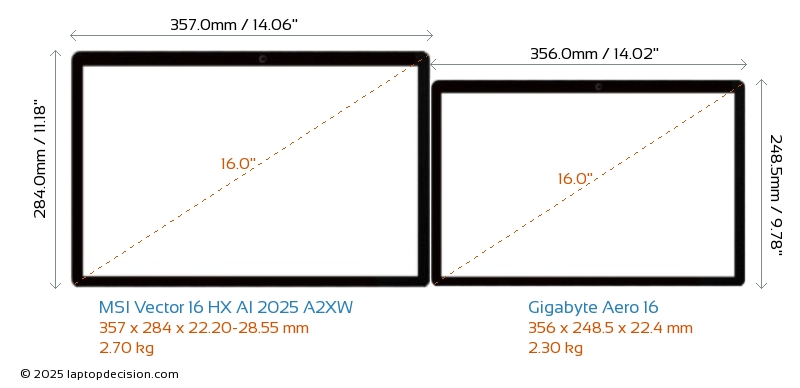 HDMI Vector 16 HX AI 2025 A2XW features an HDMI port (1x HDMI 2.1) for connecting to external monitors. Aero 16 does not have an HDMI port.