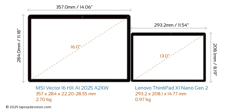 HDMI Vector 16 HX AI 2025 A2XW features an HDMI port (1x HDMI 2.1) for connecting to external monitors. ThinkPad X1 Nano Gen 2 does not have an HDMI port.