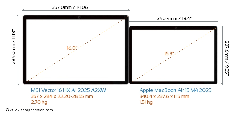 HDMI Vector 16 HX AI 2025 A2XW features an HDMI port (1x HDMI 2.1) for connecting to external monitors. MacBook Air 15 M4 2025 does not have an HDMI port.