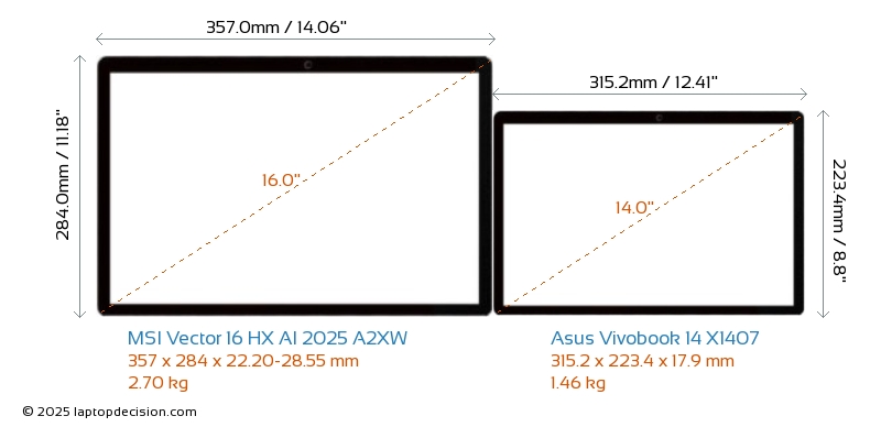 USBBoth Vector 16 HX AI 2025 A2XW and Vivobook 14 X1407 feature 2x USB 3.2 USB-A ports.Both Vector 16 HX AI 2025 A2XW and Vivobook 14 X1407 have USB Type-C ports. Vector 16 HX AI 2025 A2XW has 2x USB 4.0 USB Type-C ports, while Vivobook 14 X1407 has 2x USB 3.2 USB Type-C ports.