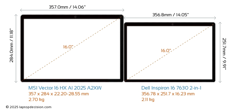 HDMIBoth Vector 16 HX AI 2025 A2XW and Inspiron 16 7630 2-in-1 feature an HDMI port. Vector 16 HX AI 2025 A2XW offers 1x HDMI 2.1, while Inspiron 16 7630 2-in-1 offers 1x HDMI 1.4.
