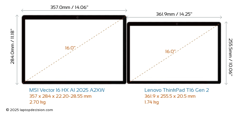 ThunderboltBoth Vector 16 HX AI 2025 A2XW and ThinkPad T16 Gen 2 feature Thunderbolt ports. Vector 16 HX AI 2025 A2XW has Thunderbolt 5, while ThinkPad T16 Gen 2 has Thunderbolt 4.