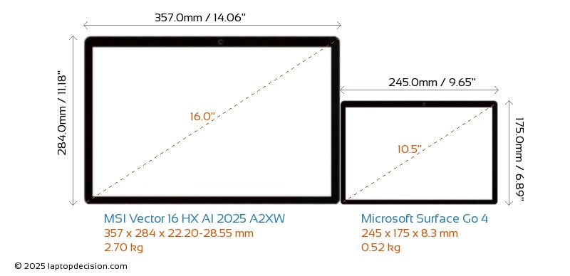 HDMI Vector 16 HX AI 2025 A2XW features an HDMI port (1x HDMI 2.1) for connecting to external monitors. Surface Go 4 does not have an HDMI port.