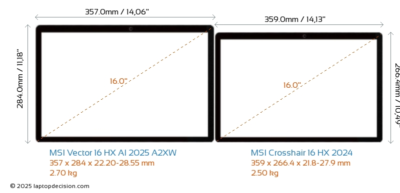 USBBoth Vector 16 HX AI 2025 A2XW and Crosshair 16 HX 2024 have USB-A ports. Vector 16 HX AI 2025 A2XW has 2x USB 3.2 USB-A ports, while Crosshair 16 HX 2024 has 3x USB 3.2 USB-A ports.Both Vector 16 HX AI 2025 A2XW and Crosshair 16 HX 2024 have USB Type-C ports. Vector 16 HX AI 2025 A2XW has 2x USB 4.0 USB Type-C ports, while Crosshair 16 HX 2024 has 1x USB 3.2 USB Type-C ports.
