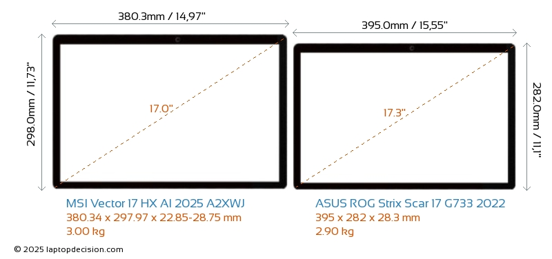 SD Card Reader Vector 17 HX AI 2025 A2XWJ is equipped with an SD Card Reader for easy access to memory cards. ROG Strix Scar 17 G733 2022 does not have an SD Card Reader.