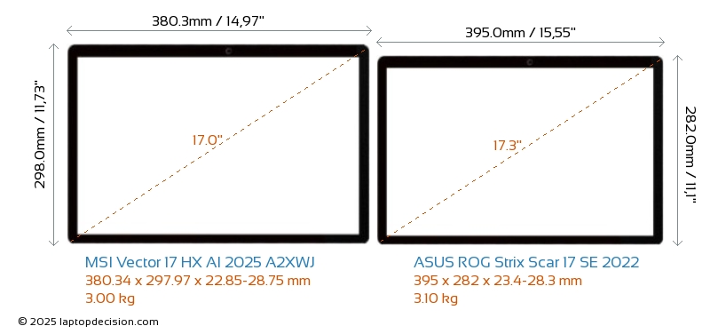 SD Card Reader Vector 17 HX AI 2025 A2XWJ is equipped with an SD Card Reader for easy access to memory cards. ROG Strix Scar 17 SE 2022 does not have an SD Card Reader.