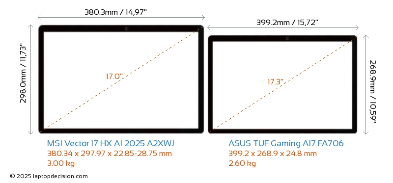 USBBoth Vector 17 HX AI 2025 A2XWJ and TUF Gaming A17 FA706 have USB-A ports. Vector 17 HX AI 2025 A2XWJ has 2x USB 3.2 USB-A ports, while TUF Gaming A17 FA706 has 3x USB 3.2 USB-A ports.Both Vector 17 HX AI 2025 A2XWJ and TUF Gaming A17 FA706 have USB Type-C ports. Vector 17 HX AI 2025 A2XWJ has 2x USB 3.2 USB Type-C ports, while TUF Gaming A17 FA706 has 1x USB 3.2 USB Type-C ports.