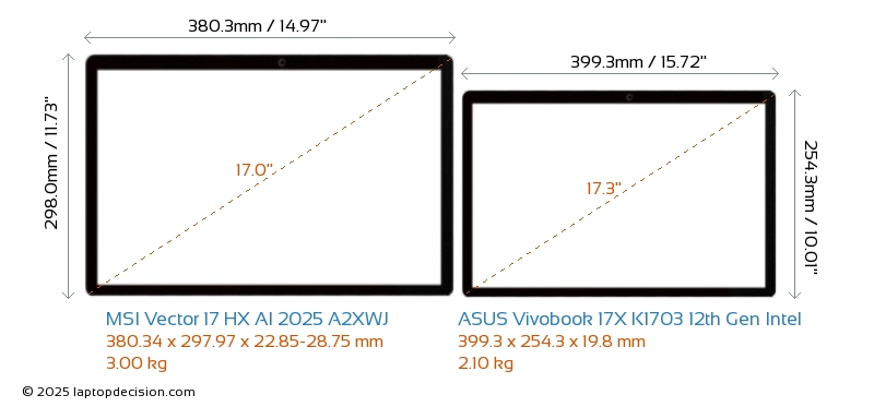 Wifi Vector 17 HX AI 2025 A2XWJ features a more advanced Wi-Fi standard v7, providing faster and more reliable wireless connections compared to Vivobook 17X K1703 12th Gen Intel (v6).