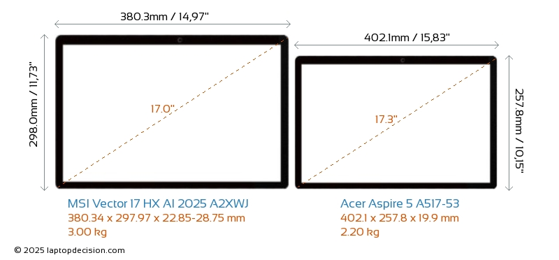 HDMIBoth Vector 17 HX AI 2025 A2XWJ and Aspire 5 A517-53 feature an HDMI port. Vector 17 HX AI 2025 A2XWJ offers 1x HDMI 2.1, while Aspire 5 A517-53 offers 1x HDMI 2.0.
