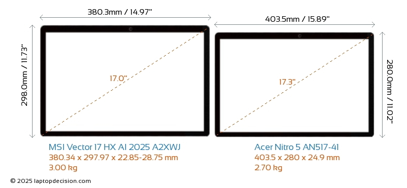 USBBoth Vector 17 HX AI 2025 A2XWJ and Nitro 5 AN517-41 have USB-A ports. Vector 17 HX AI 2025 A2XWJ has 2x USB 3.2 USB-A ports, while Nitro 5 AN517-41 has 3x USB 3.2 USB-A ports.Both Vector 17 HX AI 2025 A2XWJ and Nitro 5 AN517-41 have USB Type-C ports. Vector 17 HX AI 2025 A2XWJ has 2x USB 3.2 USB Type-C ports, while Nitro 5 AN517-41 has 1x USB 3.2 USB Type-C ports.