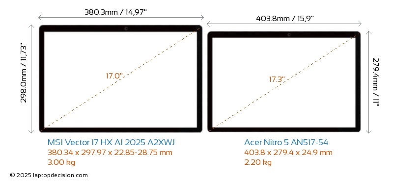 USBBoth Vector 17 HX AI 2025 A2XWJ and Nitro 5 AN517-54 have USB-A ports. Vector 17 HX AI 2025 A2XWJ has 2x USB 3.2 USB-A ports, while Nitro 5 AN517-54 has 3x USB 3.2 USB-A ports.Both Vector 17 HX AI 2025 A2XWJ and Nitro 5 AN517-54 have USB Type-C ports. Vector 17 HX AI 2025 A2XWJ has 2x USB 3.2 USB Type-C ports, while Nitro 5 AN517-54 has 1x USB 3.2 USB Type-C ports.