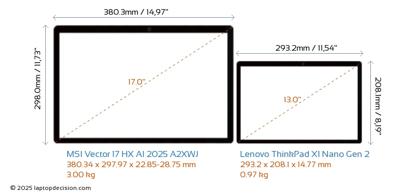 HDMI Vector 17 HX AI 2025 A2XWJ features an HDMI port (1x HDMI 2.1) for connecting to external monitors. ThinkPad X1 Nano Gen 2 does not have an HDMI port.