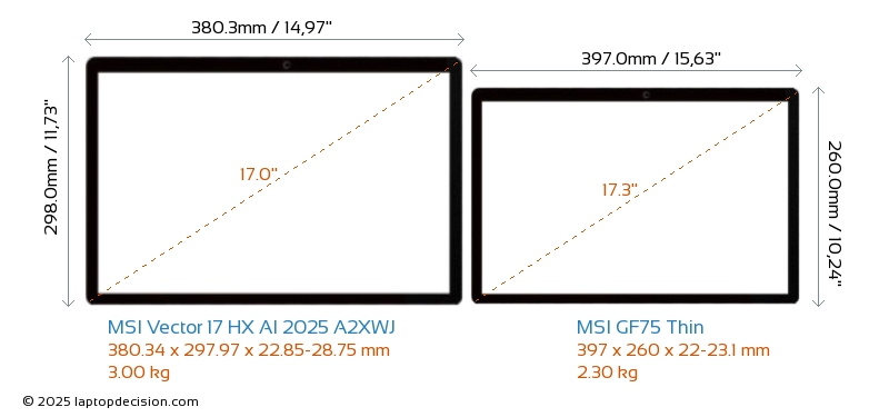 USBBoth Vector 17 HX AI 2025 A2XWJ and GF75 Thin have USB-A ports. Vector 17 HX AI 2025 A2XWJ has 2x USB 3.2 USB-A ports, while GF75 Thin has 3x USB 3.2 USB-A ports.Both Vector 17 HX AI 2025 A2XWJ and GF75 Thin have USB Type-C ports. Vector 17 HX AI 2025 A2XWJ has 2x USB 3.2 USB Type-C ports, while GF75 Thin has 1x USB 3.2 USB Type-C ports.