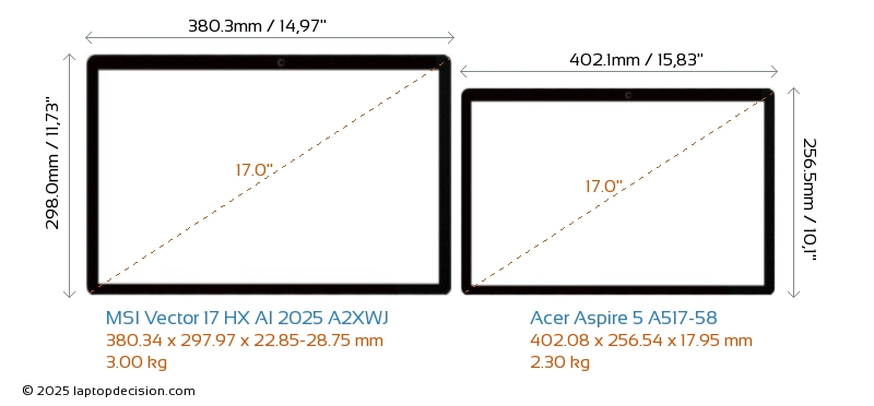 USBBoth Vector 17 HX AI 2025 A2XWJ and Aspire 5 A517-58 feature 2x USB 3.2 USB-A ports.Both Vector 17 HX AI 2025 A2XWJ and Aspire 5 A517-58 have USB Type-C ports. Vector 17 HX AI 2025 A2XWJ has 2x USB 3.2 USB Type-C ports, while Aspire 5 A517-58 has 1x USB 4.0 USB Type-C ports.