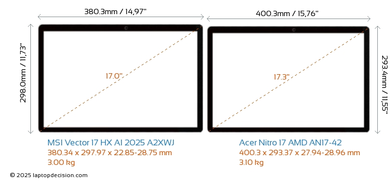 HDMIBoth Vector 17 HX AI 2025 A2XWJ and Nitro 17 AMD AN17-42 feature an HDMI port (1x HDMI 2.1) for connecting to external monitors.