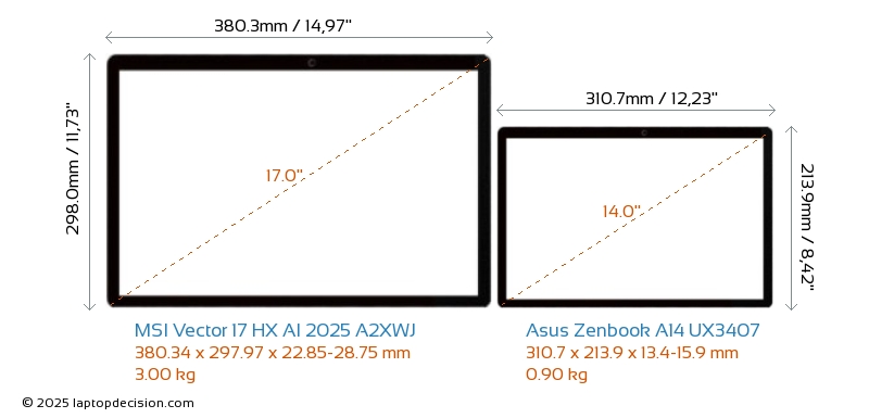 ThunderboltBoth Vector 17 HX AI 2025 A2XWJ and Zenbook A14 UX3407 feature Thunderbolt ports. Vector 17 HX AI 2025 A2XWJ has Thunderbolt 5, while Zenbook A14 UX3407 has Thunderbolt 4.