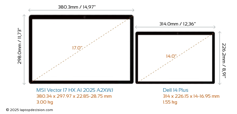 USBBoth Vector 17 HX AI 2025 A2XWJ and 14 Plus have USB-A ports. Vector 17 HX AI 2025 A2XWJ has 2x USB 3.2 USB-A ports, while 14 Plus has 1x USB 3.2 USB-A ports.Both Vector 17 HX AI 2025 A2XWJ and 14 Plus have USB Type-C ports. Vector 17 HX AI 2025 A2XWJ has 2x USB 3.2 USB Type-C ports, while 14 Plus has 2x USB 4.0 USB Type-C ports.