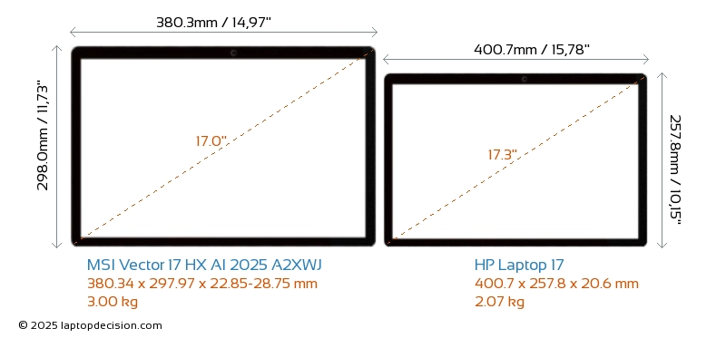 HDMIBoth Vector 17 HX AI 2025 A2XWJ and Laptop 17 feature an HDMI port. Vector 17 HX AI 2025 A2XWJ offers 1x HDMI 2.1, while Laptop 17 offers 1x HDMI 1.4.