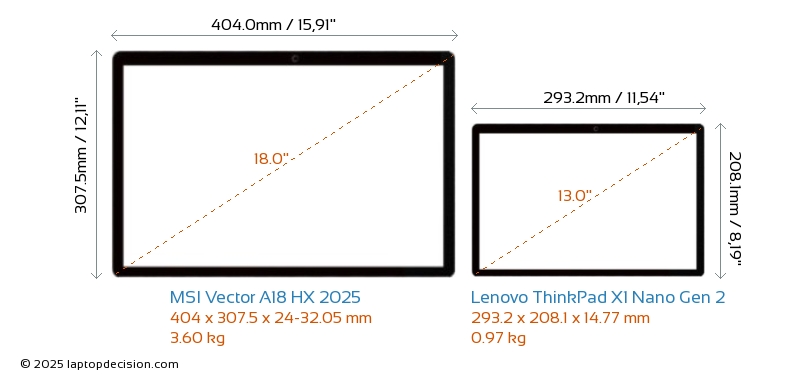 HDMI Vector A18 HX 2025 features an HDMI port (1x HDMI 2.1) for connecting to external monitors. ThinkPad X1 Nano Gen 2 does not have an HDMI port.