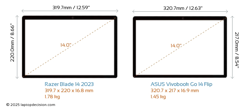 USBBoth Blade 14 2023 and Vivobook Go 14 Flip feature 2x USB 3.2 USB-A ports.Both Blade 14 2023 and Vivobook Go 14 Flip have USB Type-C ports. Blade 14 2023 has 2x USB 4.0 USB Type-C ports, while Vivobook Go 14 Flip has 1x USB 3.2 USB Type-C ports.