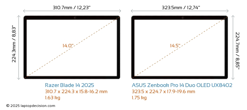 USBBoth Blade 14 2025 and Zenbook Pro 14 Duo OLED UX8402 have USB-A ports. Blade 14 2025 has 2x USB 3.2 USB-A ports, while Zenbook Pro 14 Duo OLED UX8402 has 1x USB 3.2 USB-A ports.Both Blade 14 2025 and Zenbook Pro 14 Duo OLED UX8402 have USB Type-C ports. Blade 14 2025 has 2x USB 4.0 USB Type-C ports, while Zenbook Pro 14 Duo OLED UX8402 has 2x USB 3.2 USB Type-C ports.