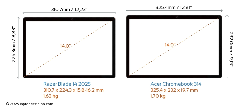 HDMIBoth Blade 14 2025 and Chromebook 314 feature an HDMI port. Blade 14 2025 offers 1x HDMI 2.1, while Chromebook 314 offers 1x HDMI 1.4.