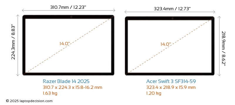 SD Card Reader Blade 14 2025 is equipped with an SD Card Reader for easy access to memory cards. Swift 3 SF314-59 does not have an SD Card Reader.