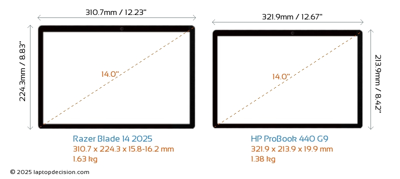 USBBoth Blade 14 2025 and ProBook 440 G9 have USB-A ports. Blade 14 2025 has 2x USB 3.2 USB-A ports, while ProBook 440 G9 has 3x USB 3.2 USB-A ports.Both Blade 14 2025 and ProBook 440 G9 have USB Type-C ports. Blade 14 2025 has 2x USB 4.0 USB Type-C ports, while ProBook 440 G9 has 1x USB 3.2 USB Type-C ports.