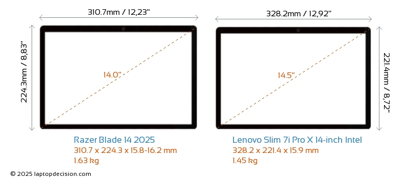 HDMIBoth Blade 14 2025 and Slim 7i Pro X 14-inch Intel feature an HDMI port. Blade 14 2025 offers 1x HDMI 2.1, while Slim 7i Pro X 14-inch Intel offers 1x HDMI 2.0.