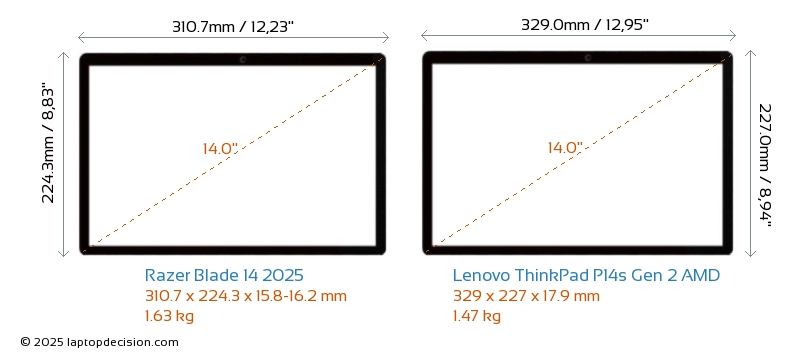 HDMIBoth Blade 14 2025 and ThinkPad P14s Gen 2 AMD feature an HDMI port. Blade 14 2025 offers 1x HDMI 2.1, while ThinkPad P14s Gen 2 AMD offers 1x HDMI 2.0.