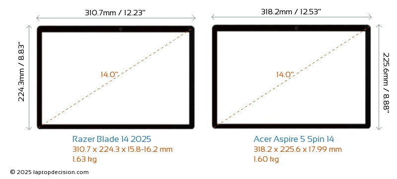 USBBoth Blade 14 2025 and Aspire 5 Spin 14 feature 2x USB 3.2 USB-A ports.Both Blade 14 2025 and Aspire 5 Spin 14 have USB Type-C ports. Blade 14 2025 has 2x USB 4.0 USB Type-C ports, while Aspire 5 Spin 14 has 1x USB 4.0 USB Type-C ports.