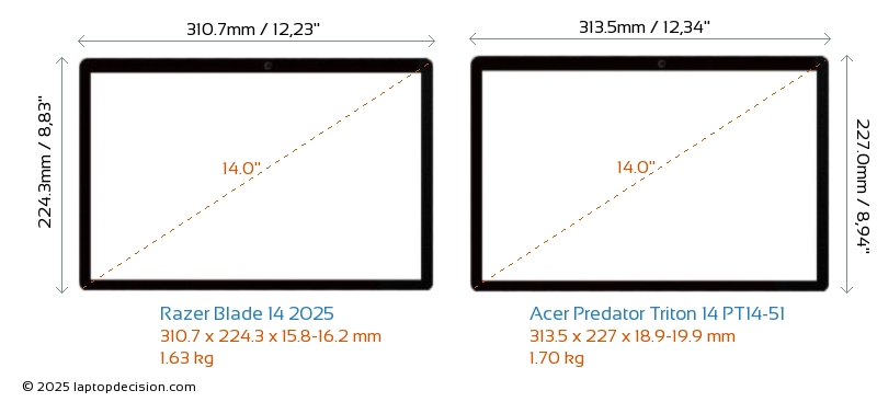 USBBoth Blade 14 2025 and Predator Triton 14 PT14-51 have USB-A ports. Blade 14 2025 has 2x USB 3.2 USB-A ports, while Predator Triton 14 PT14-51 has 3x USB 3.2 USB-A ports.Both Blade 14 2025 and Predator Triton 14 PT14-51 have USB Type-C ports. Blade 14 2025 has 2x USB 4.0 USB Type-C ports, while Predator Triton 14 PT14-51 has 1x USB 3.2 USB Type-C ports.