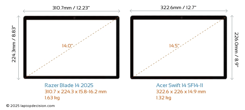 HDMI Blade 14 2025 features an HDMI port (1x HDMI 2.1) for connecting to external monitors. Swift 14 SF14-11 does not have an HDMI port.