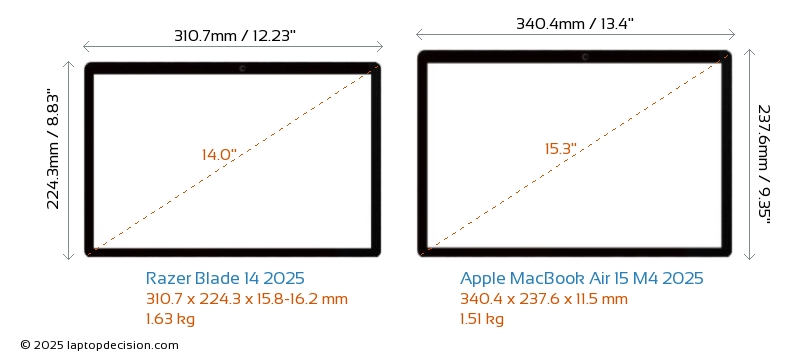 HDMI Blade 14 2025 features an HDMI port (1x HDMI 2.1) for connecting to external monitors. MacBook Air 15 M4 2025 does not have an HDMI port.