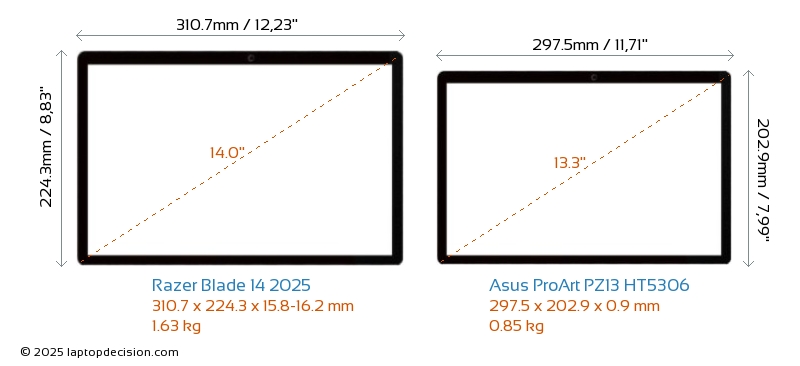 HDMI Blade 14 2025 features an HDMI port (1x HDMI 2.1) for connecting to external monitors. ProArt PZ13 HT5306 does not have an HDMI port.