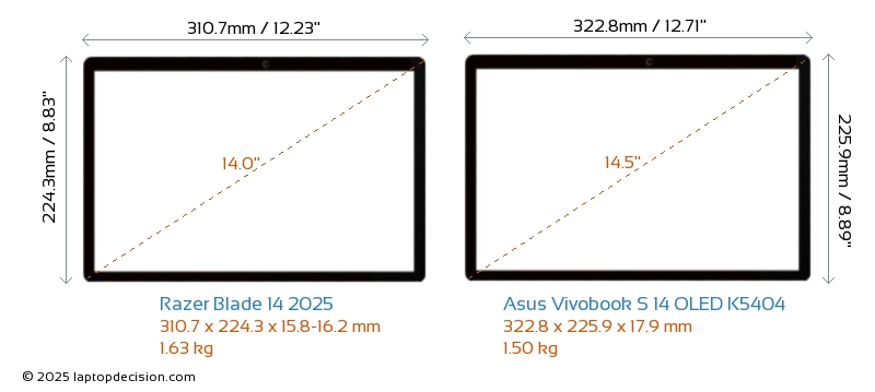 USBBoth Blade 14 2025 and Vivobook S 14 OLED K5404 feature 2x USB 3.2 USB-A ports.Both Blade 14 2025 and Vivobook S 14 OLED K5404 have USB Type-C ports. Blade 14 2025 has 2x USB 4.0 USB Type-C ports, while Vivobook S 14 OLED K5404 has 1x USB 4.0 USB Type-C ports.
