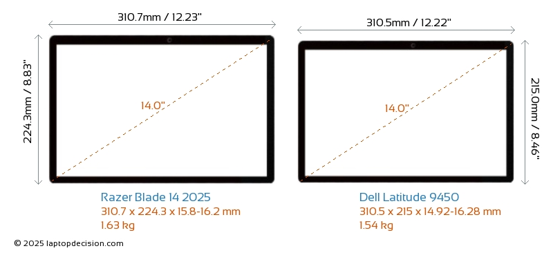 HDMI Blade 14 2025 features an HDMI port (1x HDMI 2.1) for connecting to external monitors. Latitude 9450 does not have an HDMI port.