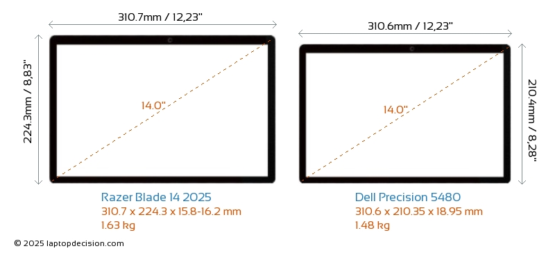 USB Blade 14 2025 is equipped with 2x USB 3.2 USB-A ports. Precision 5480 does not have USB-A ports.Both Blade 14 2025 and Precision 5480 have USB Type-C ports. Blade 14 2025 has 2x USB 4.0 USB Type-C ports, while Precision 5480 has 4x USB 4.0 USB Type-C ports.