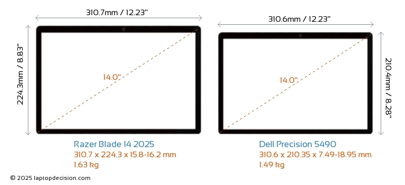 HDMI Blade 14 2025 features an HDMI port (1x HDMI 2.1) for connecting to external monitors. Precision 5490 does not have an HDMI port.