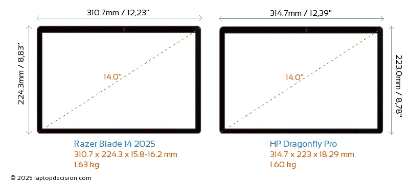 USB Blade 14 2025 is equipped with 2x USB 3.2 USB-A ports. Dragonfly Pro does not have USB-A ports.Both Blade 14 2025 and Dragonfly Pro have USB Type-C ports. Blade 14 2025 has 2x USB 4.0 USB Type-C ports, while Dragonfly Pro has 3x USB 3.2 USB Type-C ports.