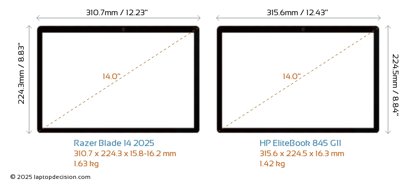 SD Card Reader Blade 14 2025 is equipped with an SD Card Reader for easy access to memory cards. EliteBook 845 G11 does not have an SD Card Reader.