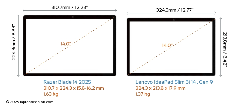USBBoth Blade 14 2025 and IdeaPad Slim 3i 14 , Gen 9 feature 2x USB 3.2 USB-A ports.Both Blade 14 2025 and IdeaPad Slim 3i 14 , Gen 9 have USB Type-C ports. Blade 14 2025 has 2x USB 4.0 USB Type-C ports, while IdeaPad Slim 3i 14 , Gen 9 has 1x USB 3.2 USB Type-C ports.