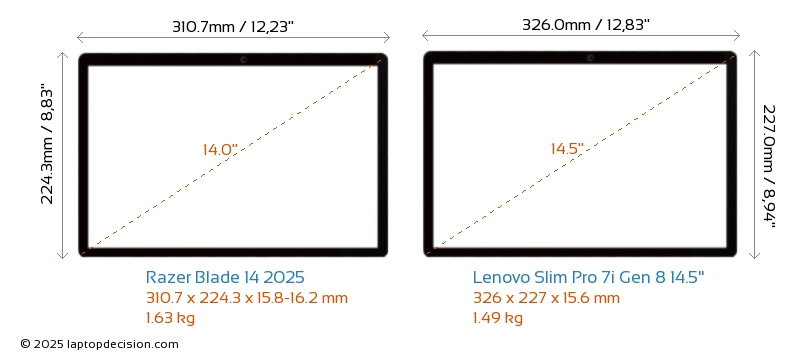 HDMIBoth Blade 14 2025 and Slim Pro 7i Gen 8 14.5" feature an HDMI port. Blade 14 2025 offers 1x HDMI 2.1, while Slim Pro 7i Gen 8 14.5" offers 1x HDMI 2.0.