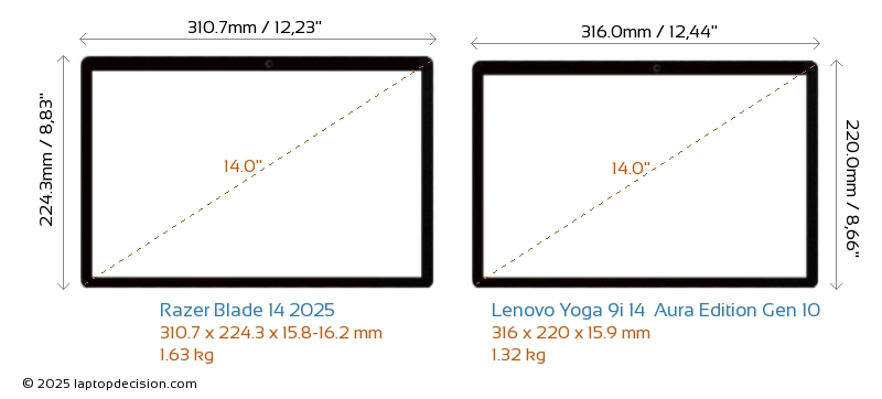 USBBoth Blade 14 2025 and Yoga 9i 14 Aura Edition Gen 10 have USB-A ports. Blade 14 2025 has 2x USB 3.2 USB-A ports, while Yoga 9i 14 Aura Edition Gen 10 has 1x USB 3.2 USB-A ports.Both Blade 14 2025 and Yoga 9i 14 Aura Edition Gen 10 have USB Type-C ports. Blade 14 2025 has 2x USB 4.0 USB Type-C ports, while Yoga 9i 14 Aura Edition Gen 10 has 3x USB 4.0 USB Type-C ports.