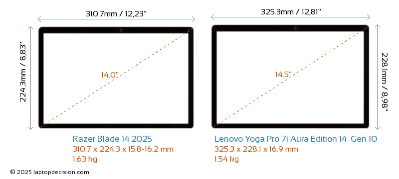 USBBoth Blade 14 2025 and Yoga Pro 7i Aura Edition 14 Gen 10 feature 2x USB 3.2 USB-A ports.Both Blade 14 2025 and Yoga Pro 7i Aura Edition 14 Gen 10 feature 2x USB 4.0 USB Type-C ports.