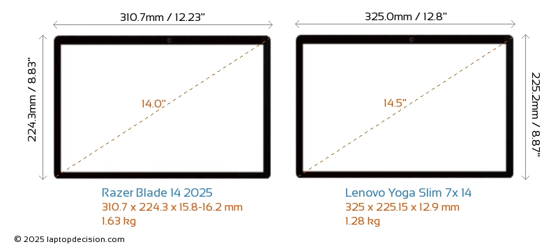 HDMI Blade 14 2025 features an HDMI port (1x HDMI 2.1) for connecting to external monitors. Yoga Slim 7x 14 does not have an HDMI port.