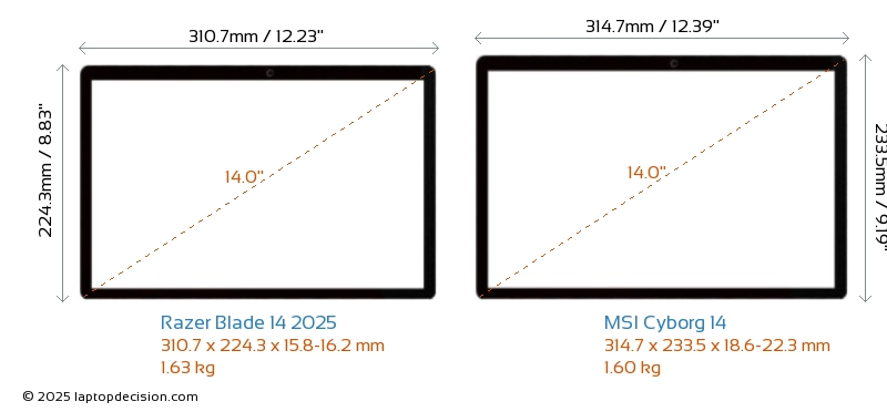 USBBoth Blade 14 2025 and Cyborg 14 feature 2x USB 3.2 USB-A ports.Both Blade 14 2025 and Cyborg 14 have USB Type-C ports. Blade 14 2025 has 2x USB 4.0 USB Type-C ports, while Cyborg 14 has 1x USB 3.2 USB Type-C ports.